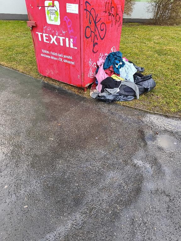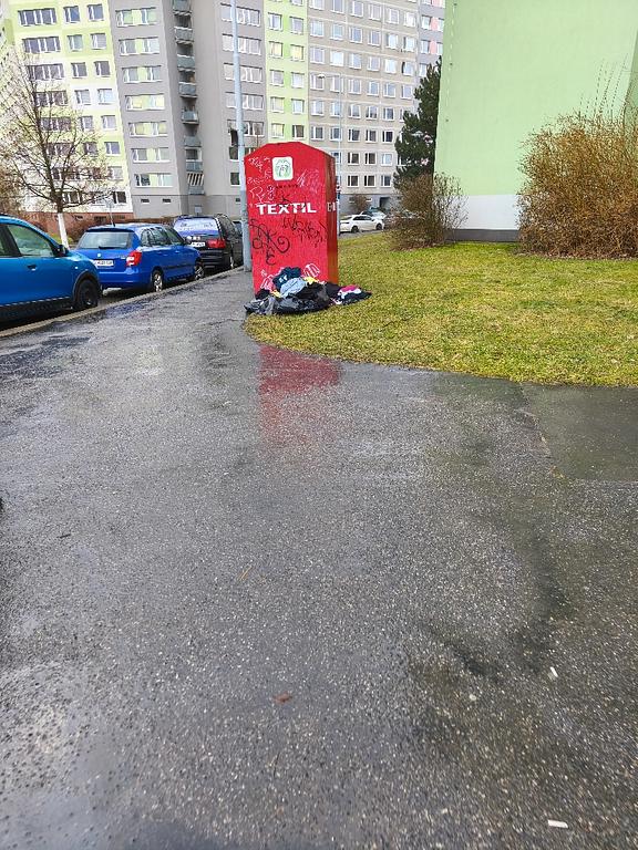 nevyvezená popelnice na textil na pozemku 2131/122, k. ú. Stodůlky. Kontejner stojí neoprávněně na uvedeném pozemku ve správě MČ Praha 13 a společnost Help Tex na výzvy nereaguje.