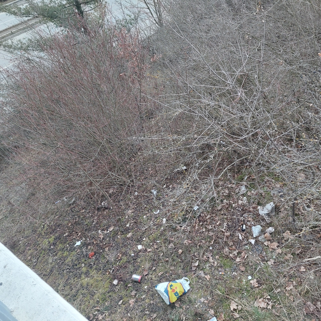 Nepořádek pod lávkou přes ulici Jeremiášova u zastávky Ovčí Hájek.Pod lávkou zjevně někdo bydlí.Po okolí nepořádek z obou stran lávky.