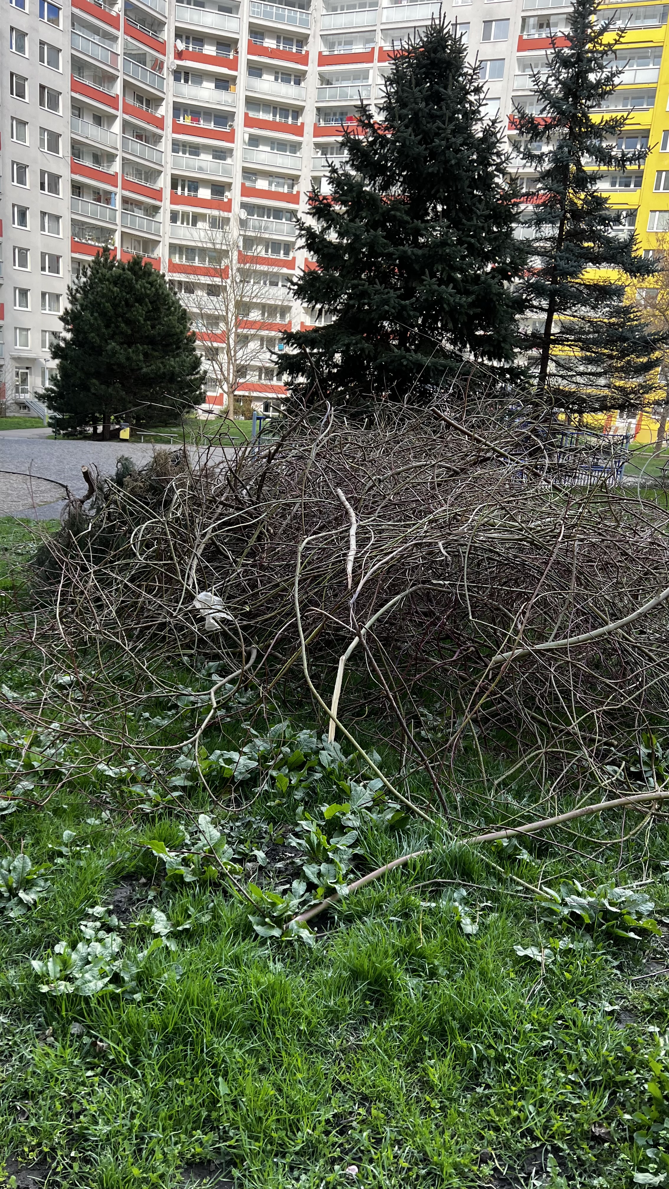 Dobrý den, jedná se o výsledek řezu keřů na předzahrádkách bytových domů, která provedli neoprávněně obyvatelé tohoto domu. V místě byly také provedeny výsadby, které nebyly povoleny vlastníkem ani správcem pozemku. Ořezané větve budou odklizeny, ale upozorňujeme, že tento způsob údržby pozemků není dle zákona možný. Děkujeme za podnět, OŽP