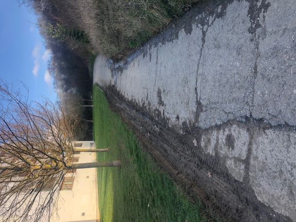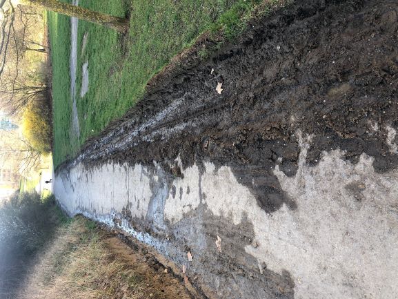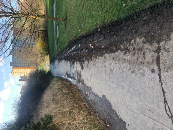 Tento problém existuje již řadu let, bohužel nyní se stala situace kritickou, neboť svah zabírá téměř polovinu obslužné komunikace pro park a automobily tuto překážku objíždějí po travnatém pozemku, který tím devastují (viz foto).