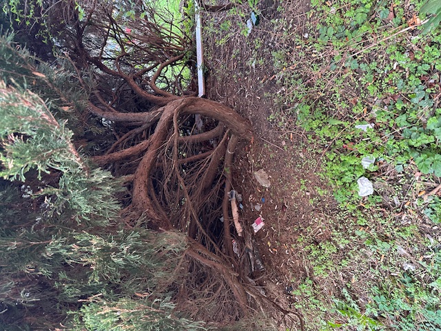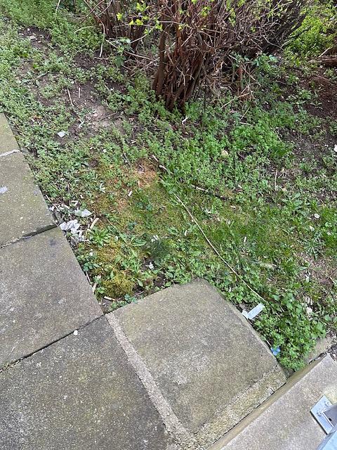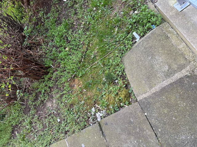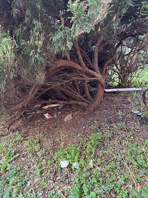 odpadky a nedopalky v túji a v křoví a vedle křoví v ulici Neústupného číslo 8.