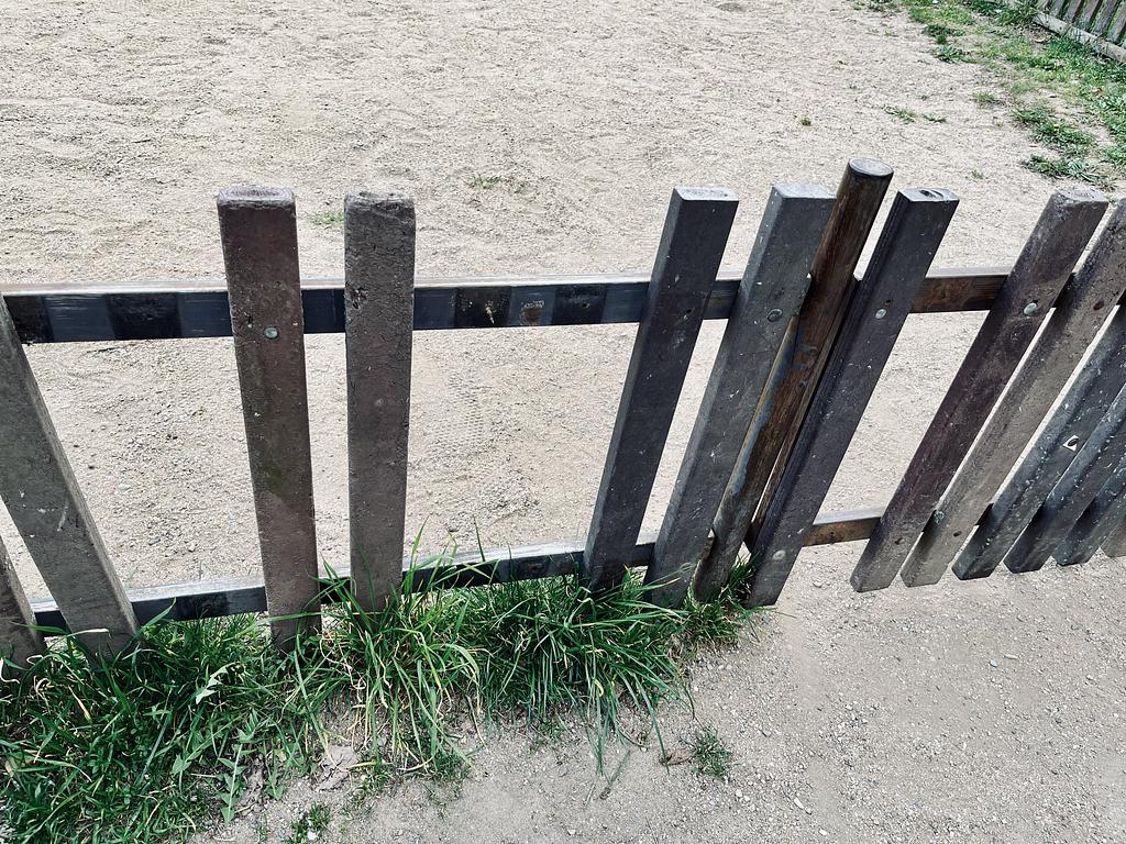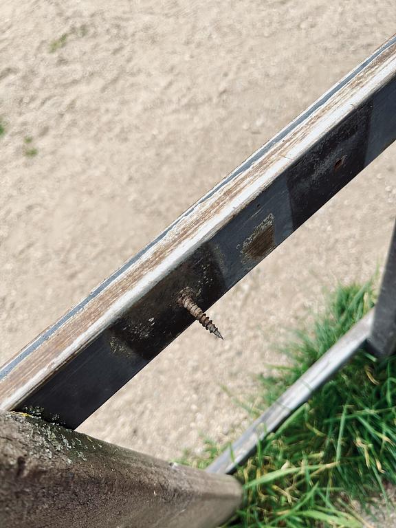 Nebezpečně trčící vrut na plotě dětského hřiště.