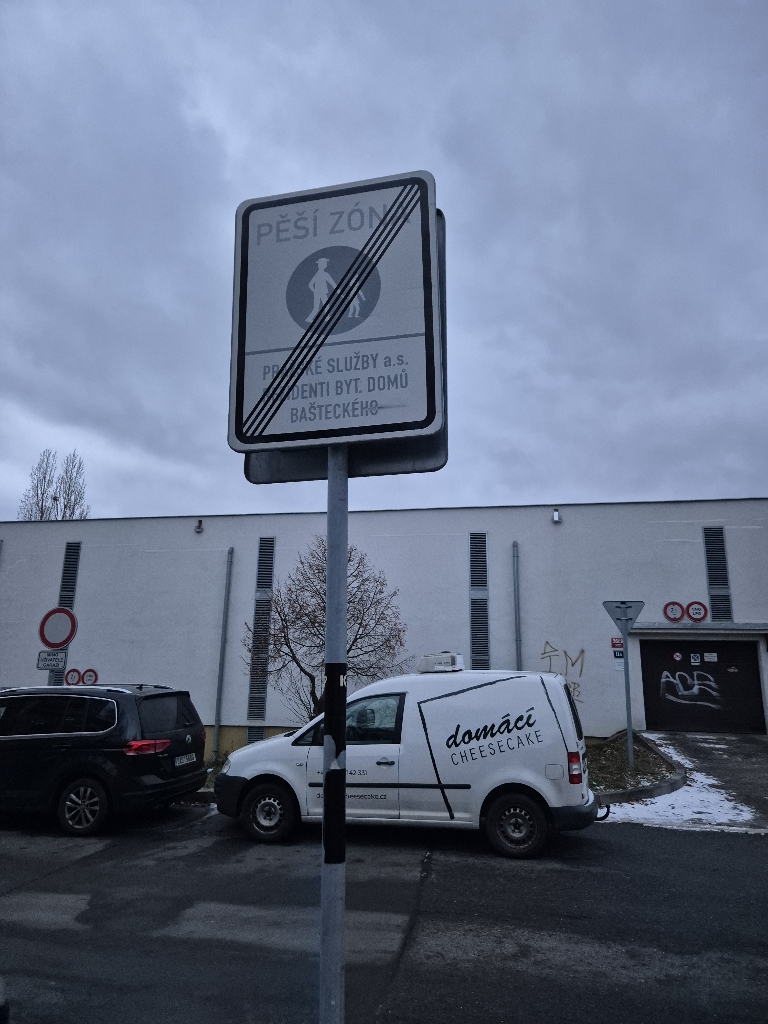 Při opravě poražené dopravní značky u přechodu pro chodce na rohu Bašteckého a Pavrovského ulice nebyla na nově instalovaný sloup umístěna značka Pěší zóna pro příslušný úsek Bašteckého ulice s omezením vjezdu pouze pro rezidenty přilehlých domů. Tato je nyní pouze u druhého vjezdu na pěší zónu, nikoli už na vjezdu u přechodu pro chodce.