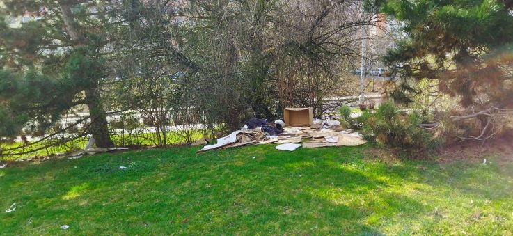 Nepořádek v zeleni na křižovatce ulic Kettnerova x Mukařovského v úrovni stožáru VO č. 508610, parcela 2160/1, k. ú. Stodůlky.
