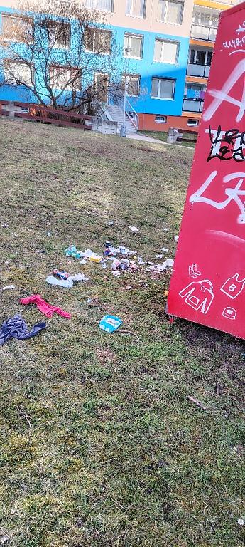 Dobrý den, nepořádek kolem kontejneru na textil byl zadán k úklidu. Děkujeme za podnět, 0ŽP.