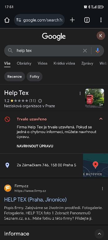 Dobrý den, společnost HELP TEX je v konkursu. Soudem byl ustanoven konkursní správce, kterého jsme požádali o odvoz kontejnerů a úklid nepořádku. Bohužel, majitelka společnosti nereaguje a proto byla předvolána k soudu, aby mohla být celá záležitost s kontejnery řešena. Prosíme o trpělivost. Děkujeme za pochopení