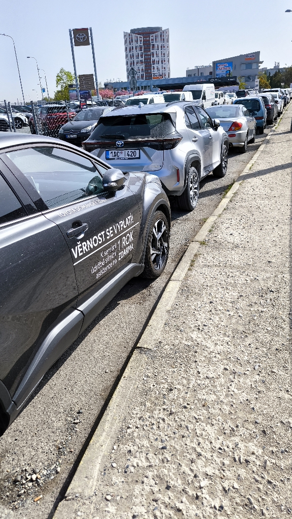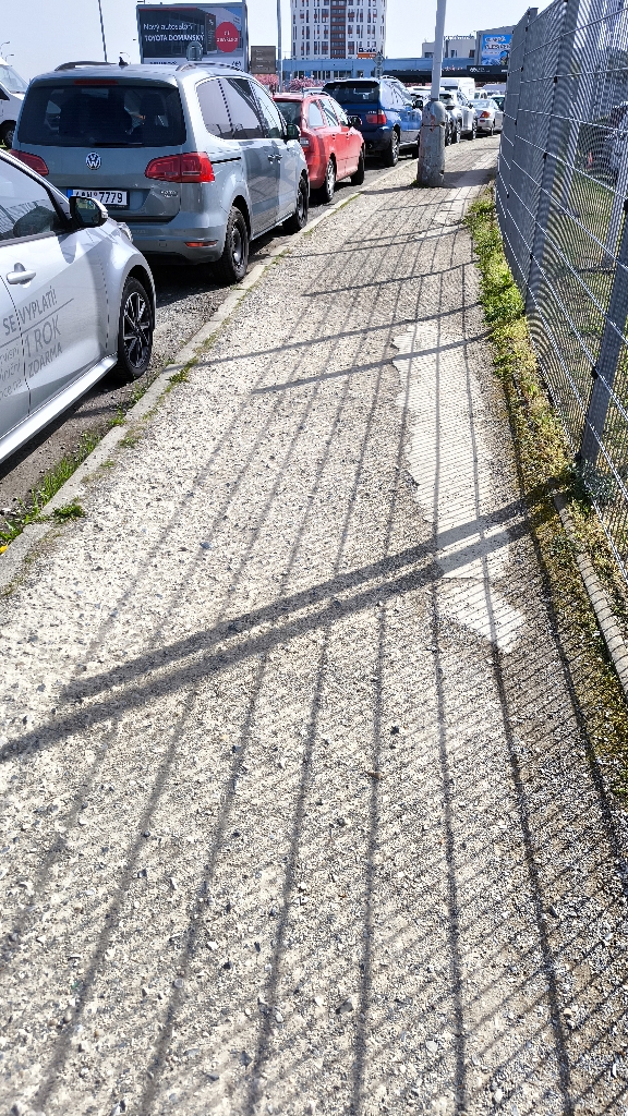Chodník v dezolátním stavu, nelze procházet okolo zaparkovaných aut přilehlých autosalonu stojících v zákazu.