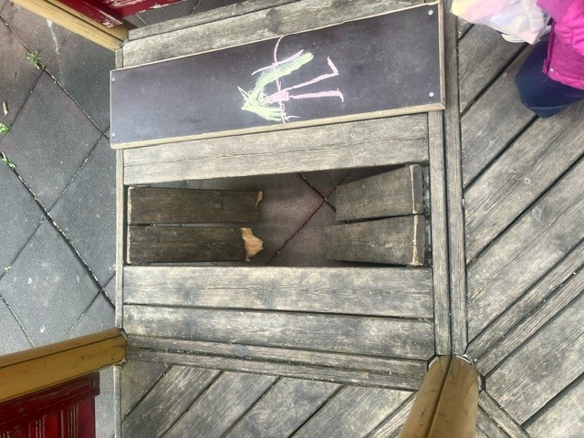 U MŠ Rosnička je rozbitá průlezka, z prasklých prken trčí ostré hřebíky.