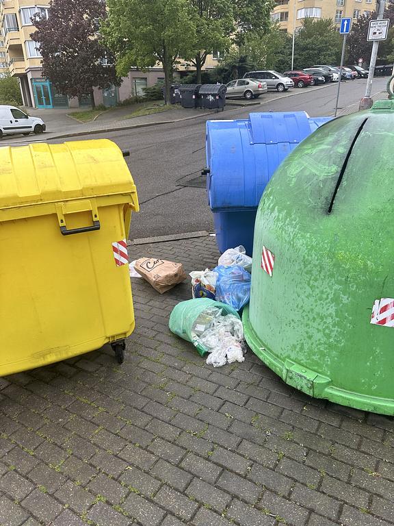 Neporadek a vyhazene odpadky u kontejneru trideneho odpadu
