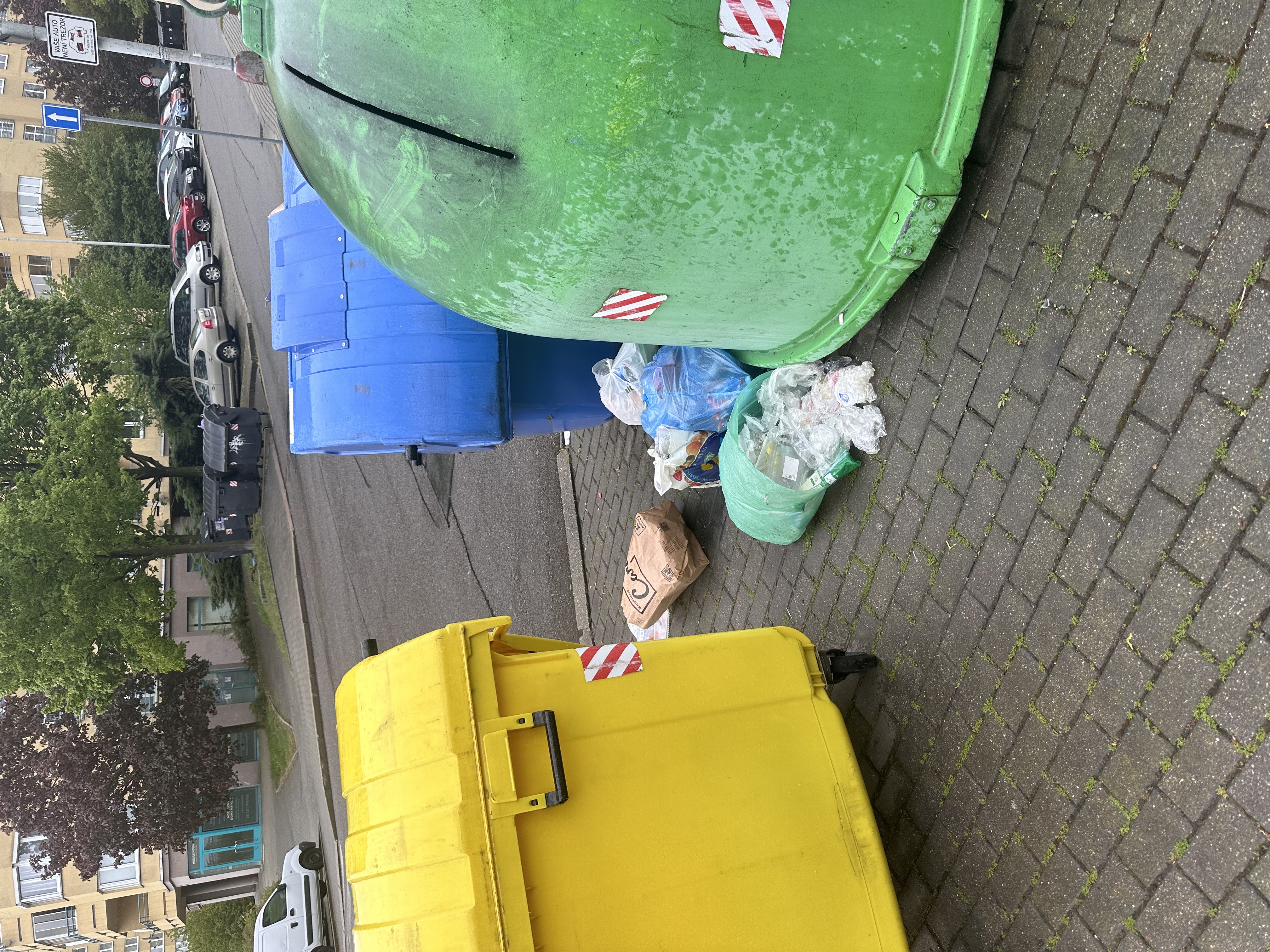 Neporadek a vyhazene odpadky u kontejneru trideneho odpadu