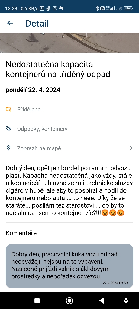Dobrý den, je mám tady jedno kdo nebo jak má odvoz na starost. Jde o to že kapacita nestačí, nevím s kým máme tu čest na druhé straně těchto řádků, ale u vás před domem by to asi taky vadilo, tak jsem prostě nechte dát další kontejnery pro těch 13 vchodů.