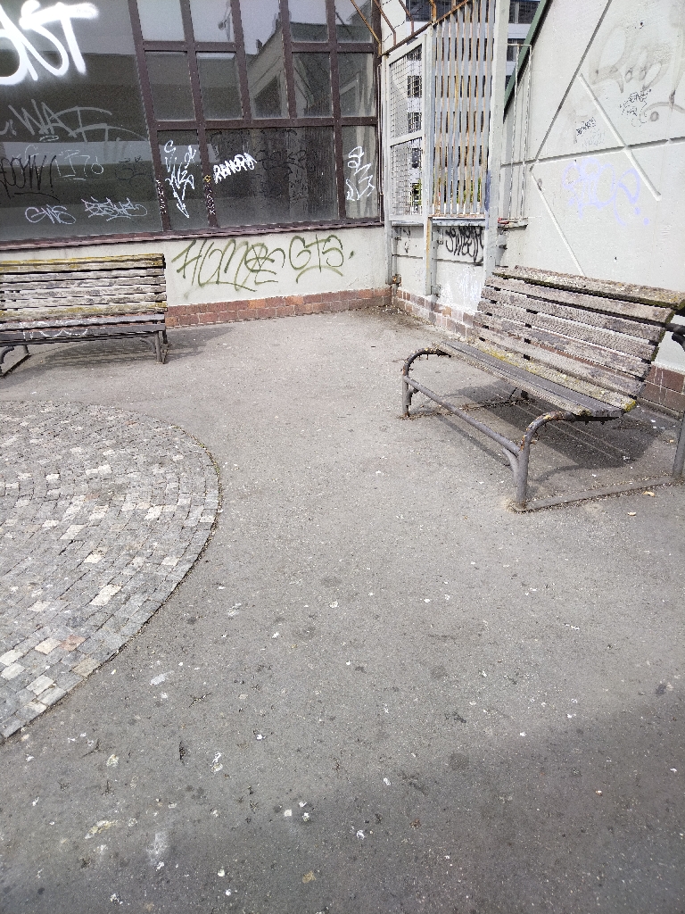 rozbité lavičky a binec