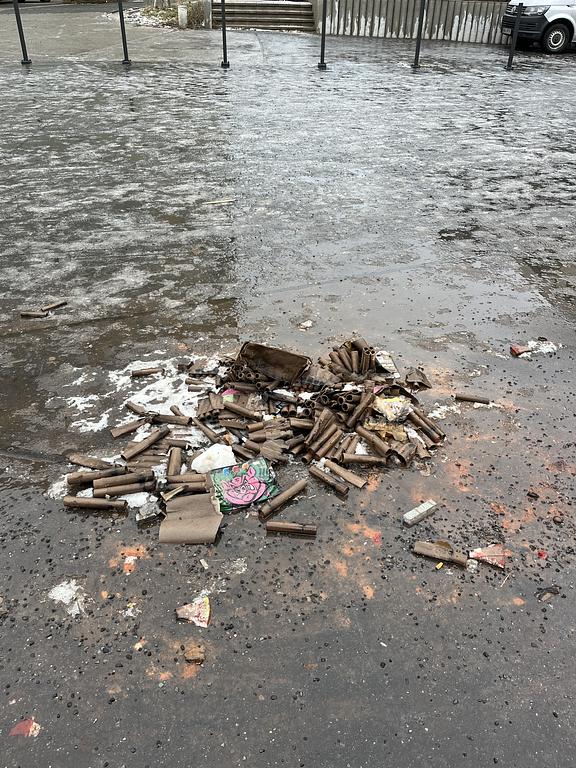 Neodklizené rachejtle po Silvestru před poliklinikou Lípa