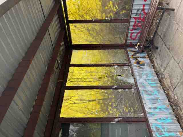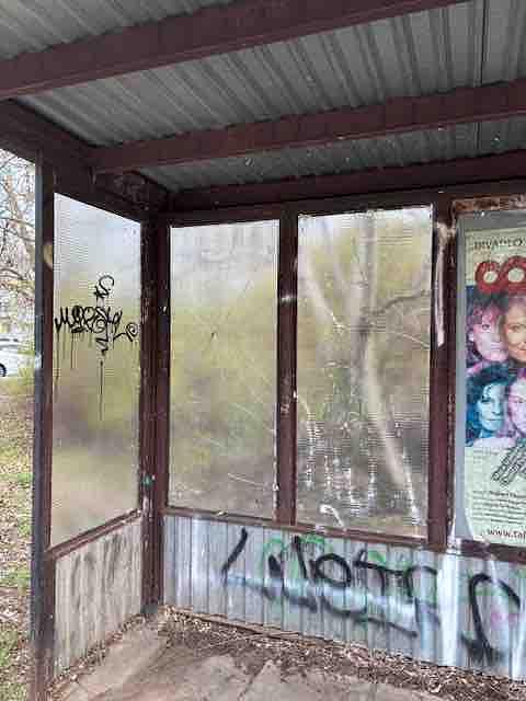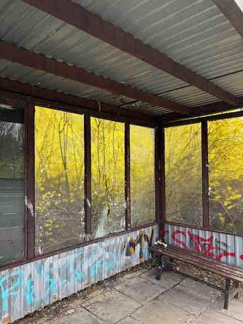 Rozbitá skla a celkově otřesný stav zastávky autobusu Vackova a jejího blízkého okolí