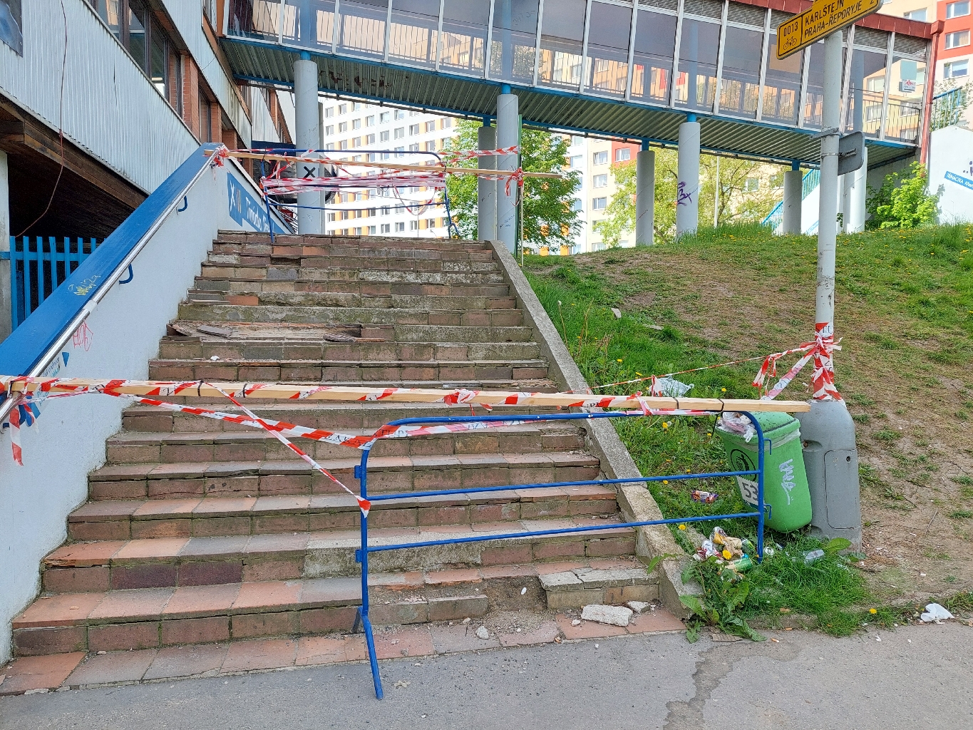 Schody na Lukách se rozpadají. Jediné řešení, které městská část udělala, dala tam pásky. Rozbité místo přitahuje vandly, jakoby jich už na stanici Luka nebylo dost.