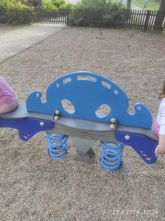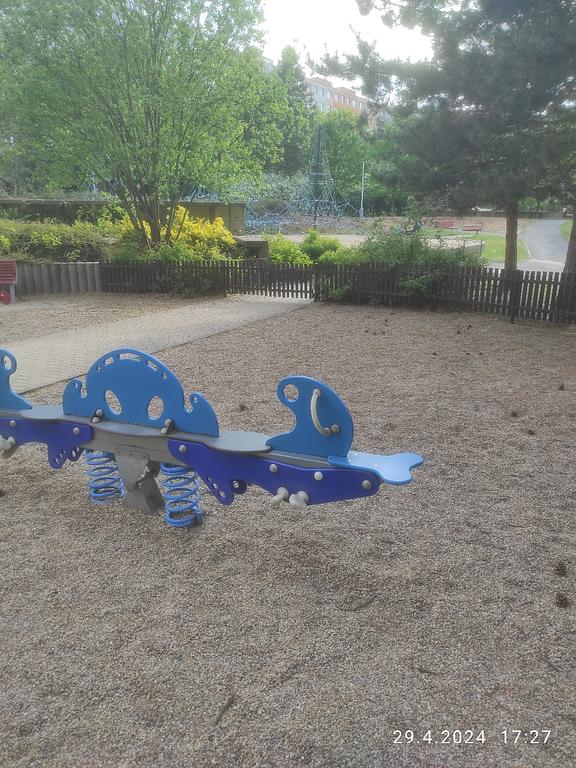 Dobrý den, herní prvek – houpačka s prasklou pružinou byl správcovskou firmou demontován, po objednání náhradní dílu bude opět zprovozněn. Děkujeme za podnět, OŽP