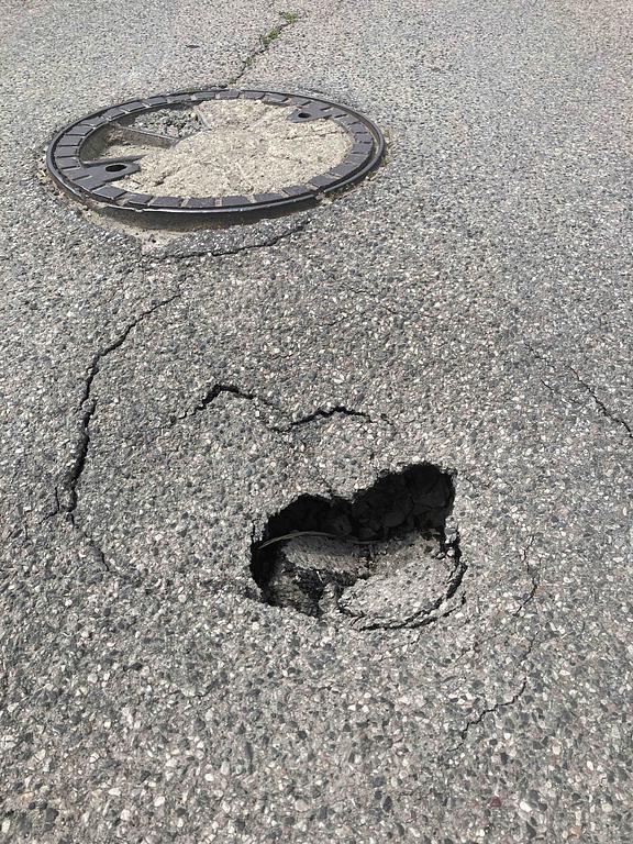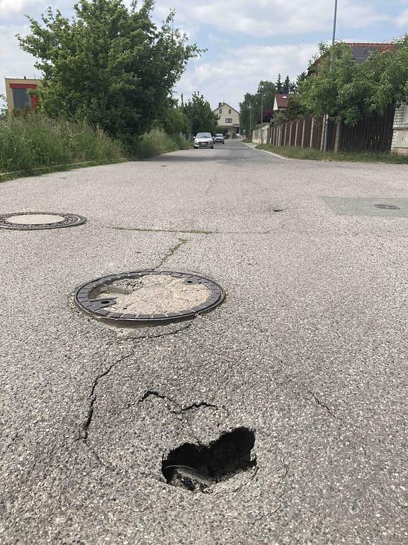 Propadlý asfalt, je vidět hlína pod vozovkou.
