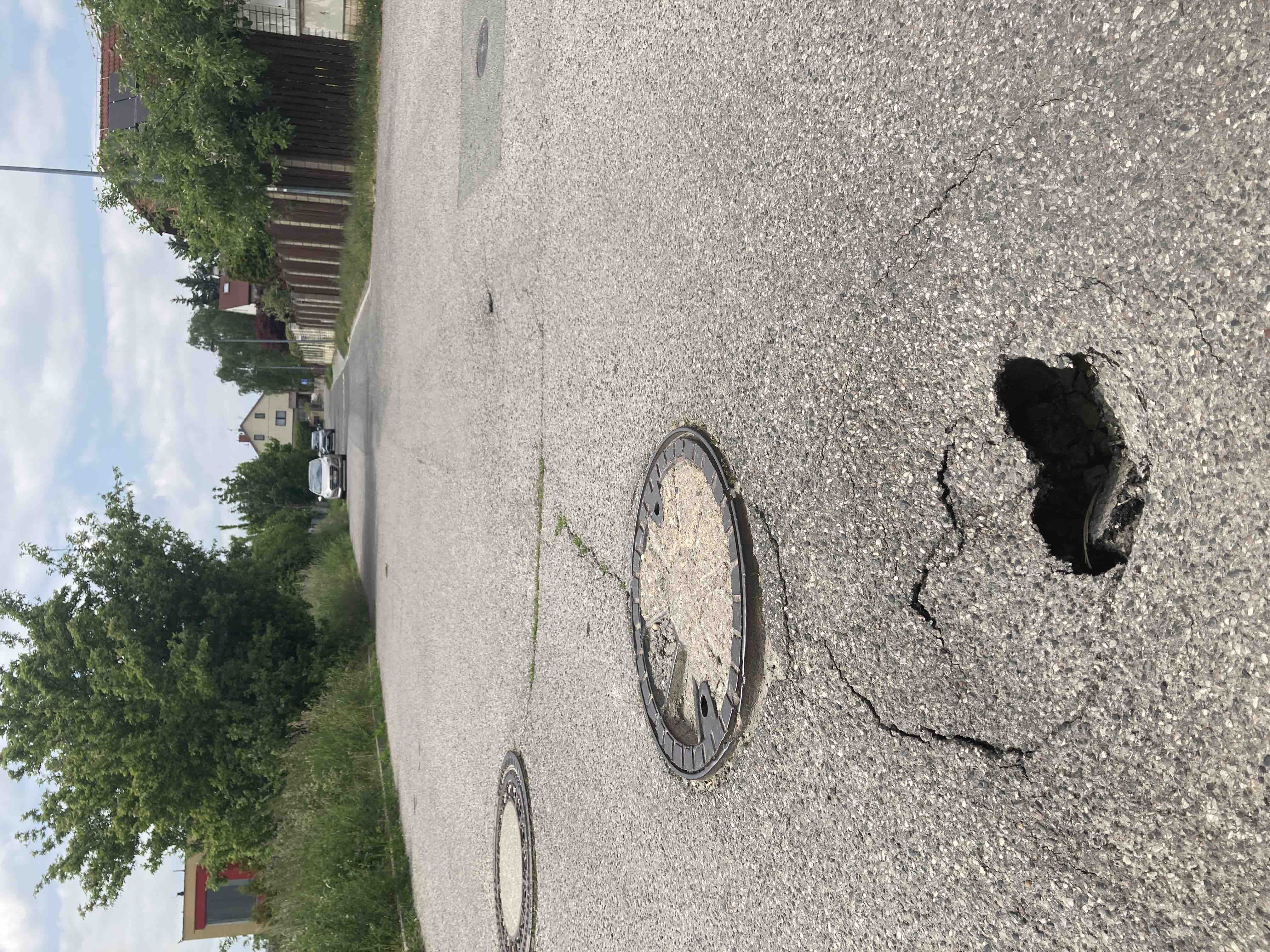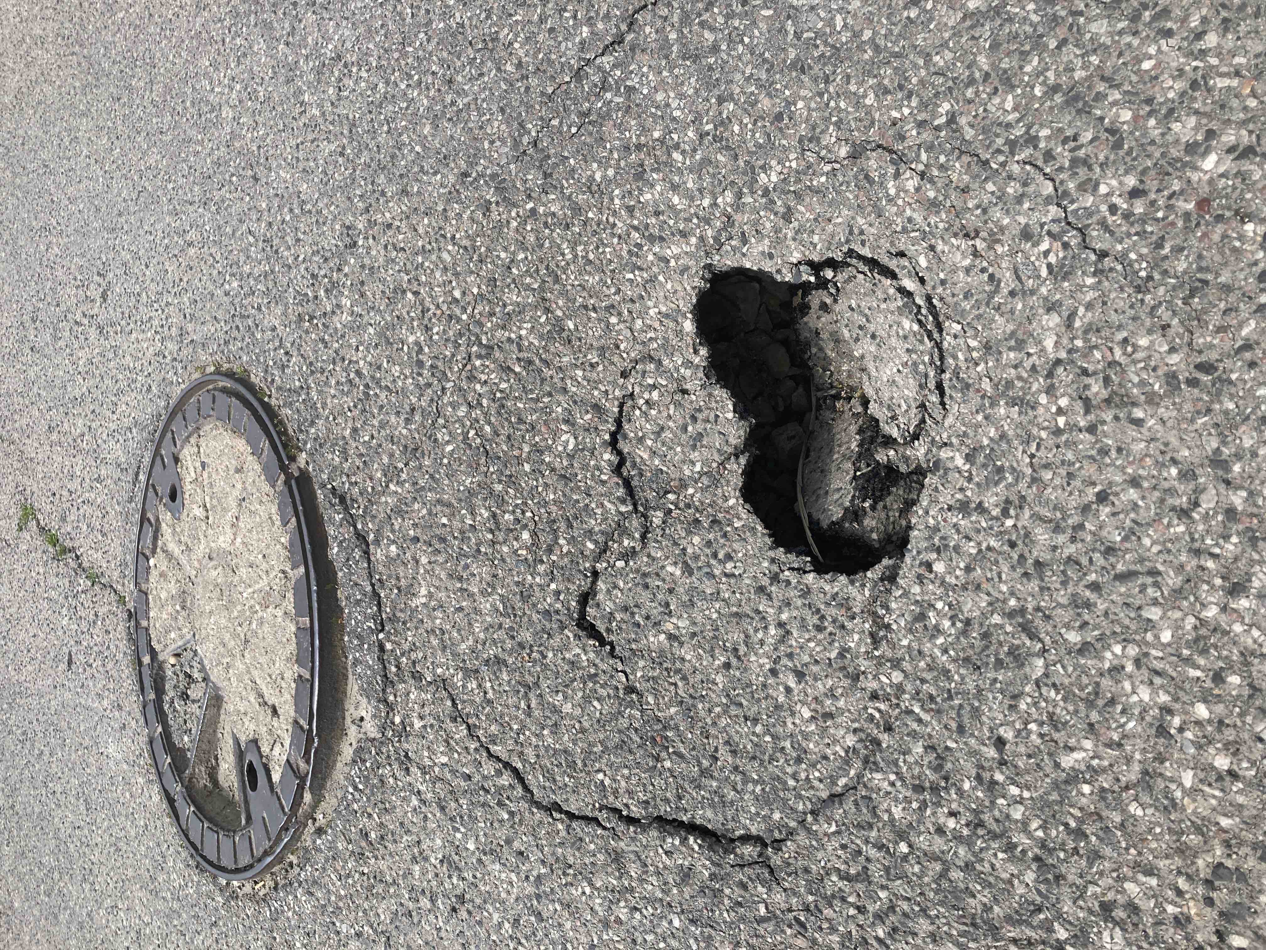 Propadlý asfalt, je vidět hlína pod vozovkou.