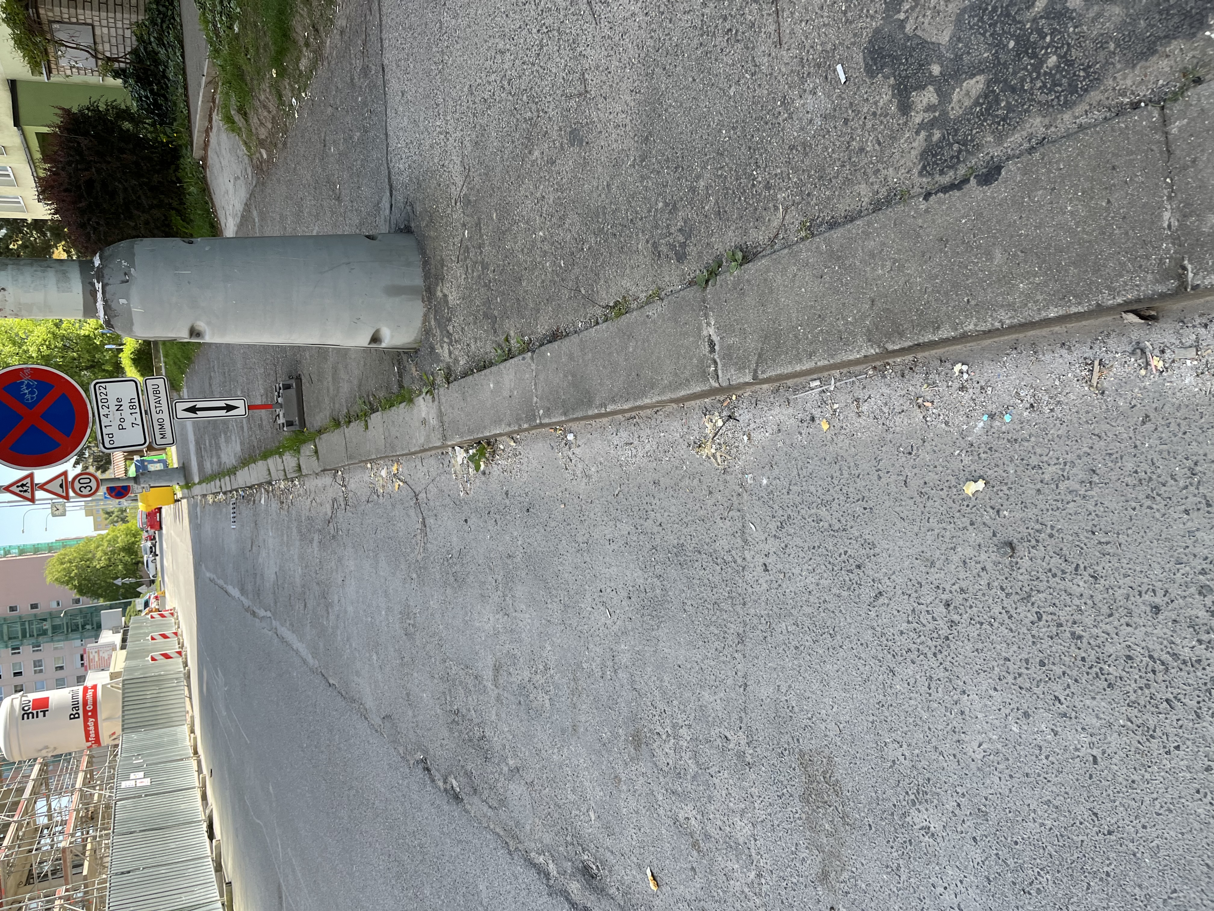 Nepořádek na silnici a na chodníku u stavby Paprsek
