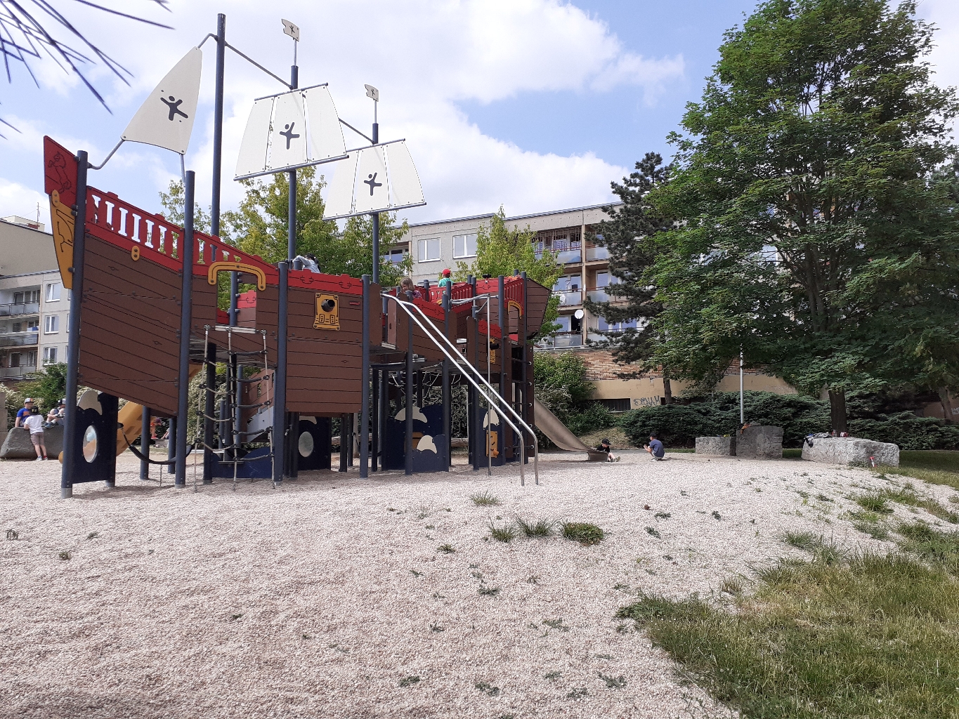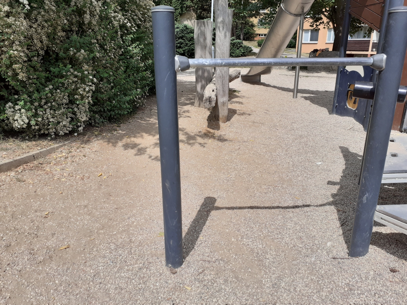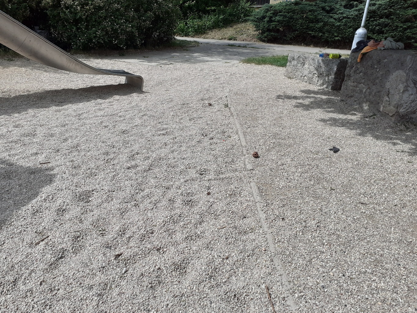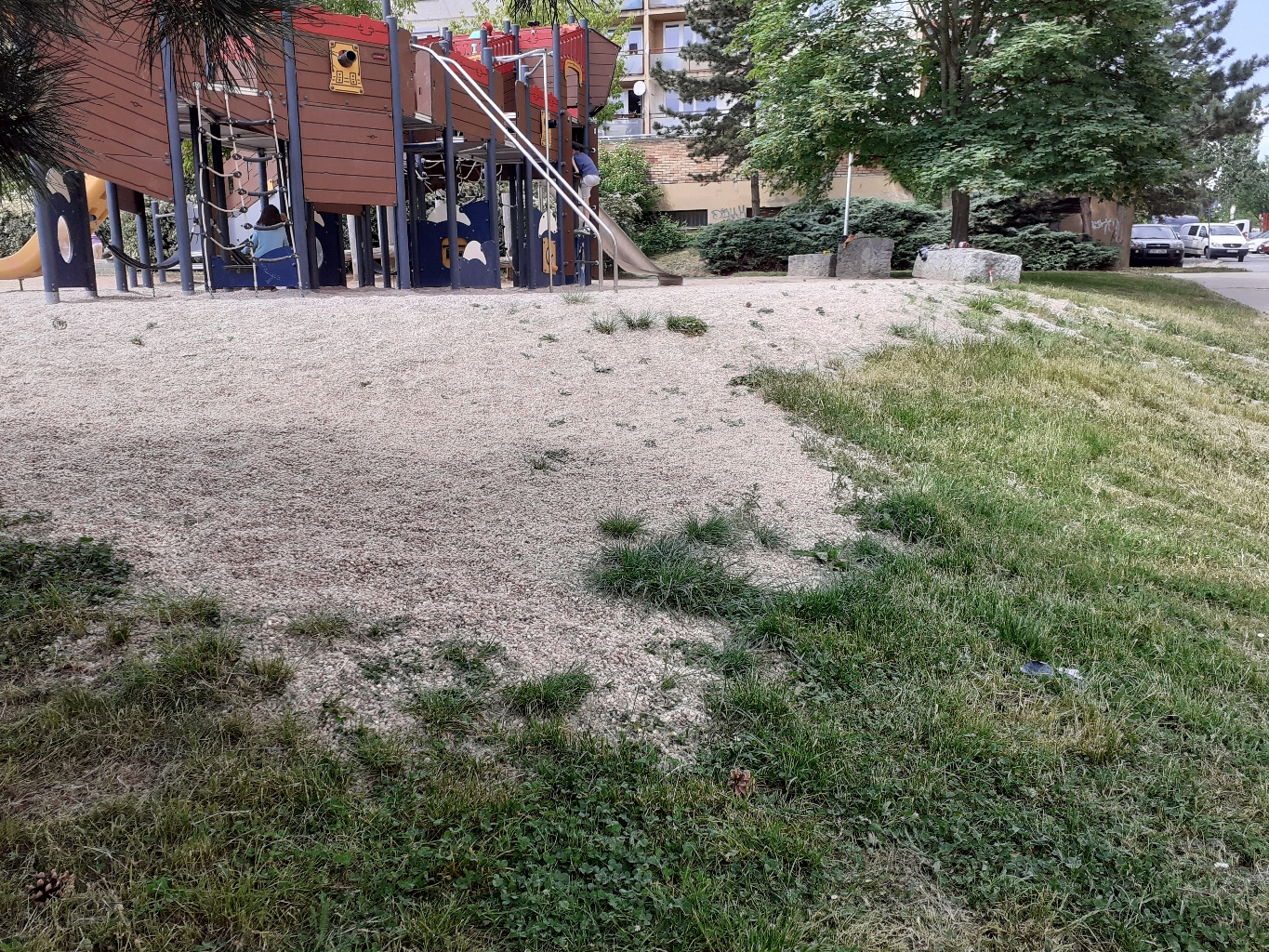 Kamínky z hřiště jsou mimo na trávě a u prolézaček úplně chybí.