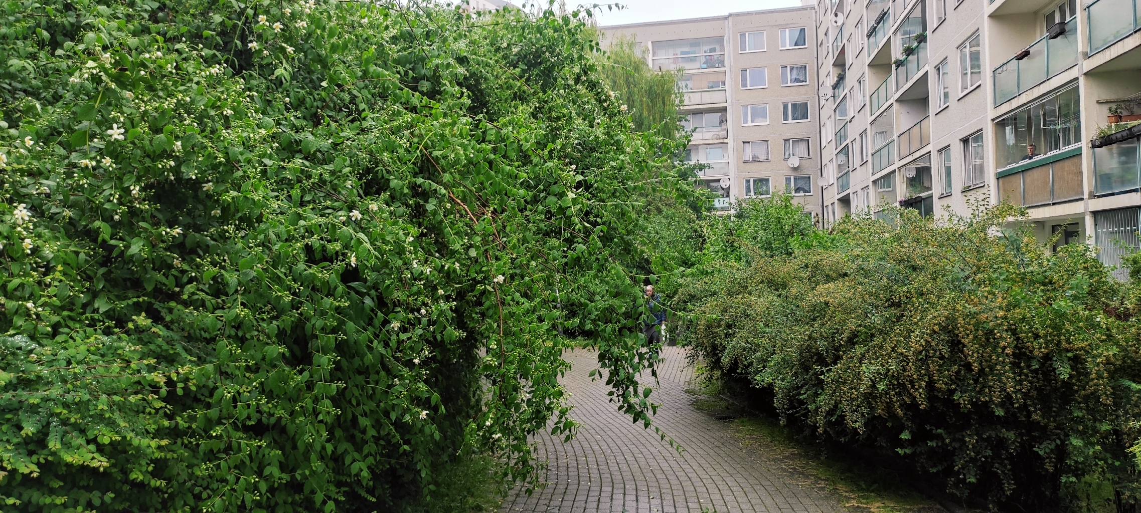 přerostlé keře v dvoře Janského/Bašteckého/Drimlova. při dešti pak spadávají na chodníky