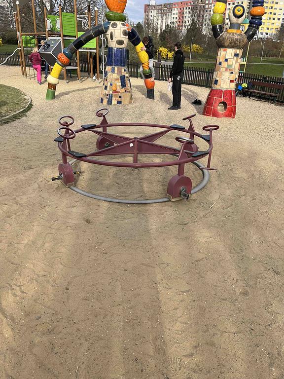 Dobrý den, oprava kolotoče bude provedena správcovskou firmou. Děkujeme za podnět, OŽP.