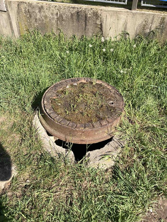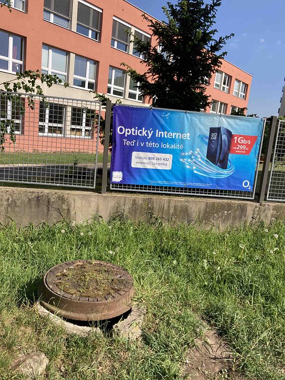 otevřené víko kanálu prakticky i s rámem okolo pod kterou je šachta Hluboká minimálně 5 m těsně vedle školy