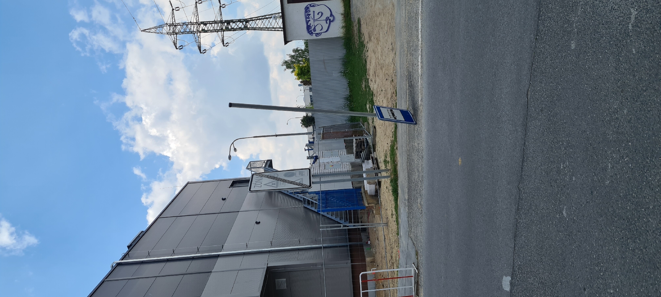Poškozená dopravní značka označující Bus zastávku Za Mototechnou.