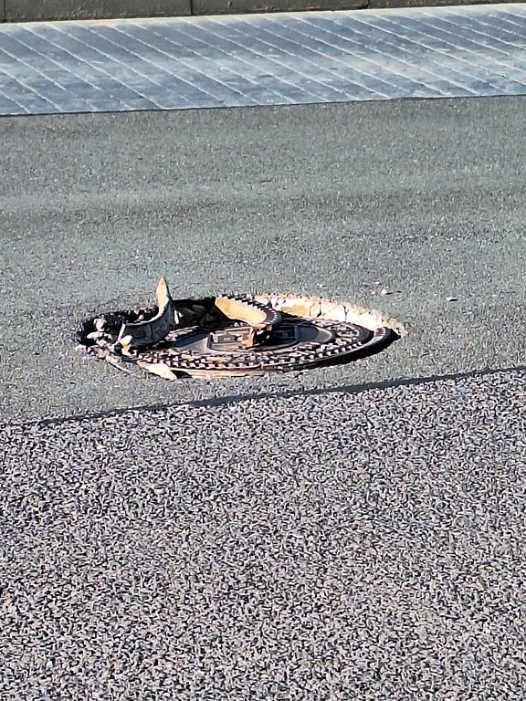 propadlý kanál a zničené kovové součásti v ulici Tlumačovská mezi autobus. zastávkami Bašteckého