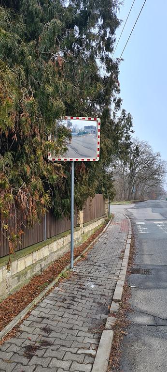 Křižovatka Za Mototechnou X K Hájům. Zrcadlo bylo částečně otočeno, takže není v něm plný výhled.