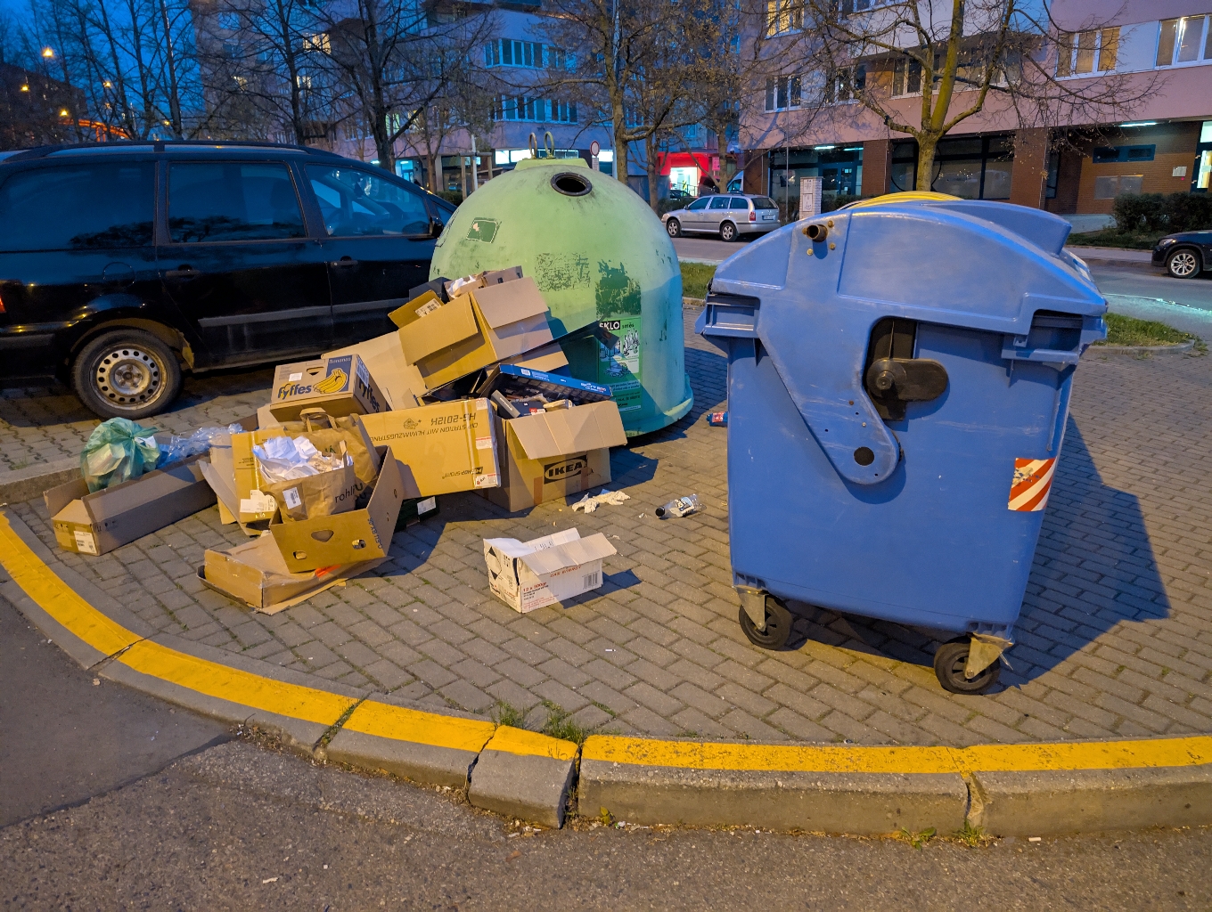 Popeláře zřejmě nezajímá odpad mimo kontejner. Popeláři sice dnes vyvezli kontejner, ovšem co se nevešlo do kontaktu kvůli nedostatečné kapacitě, to se volně válí na ulici.