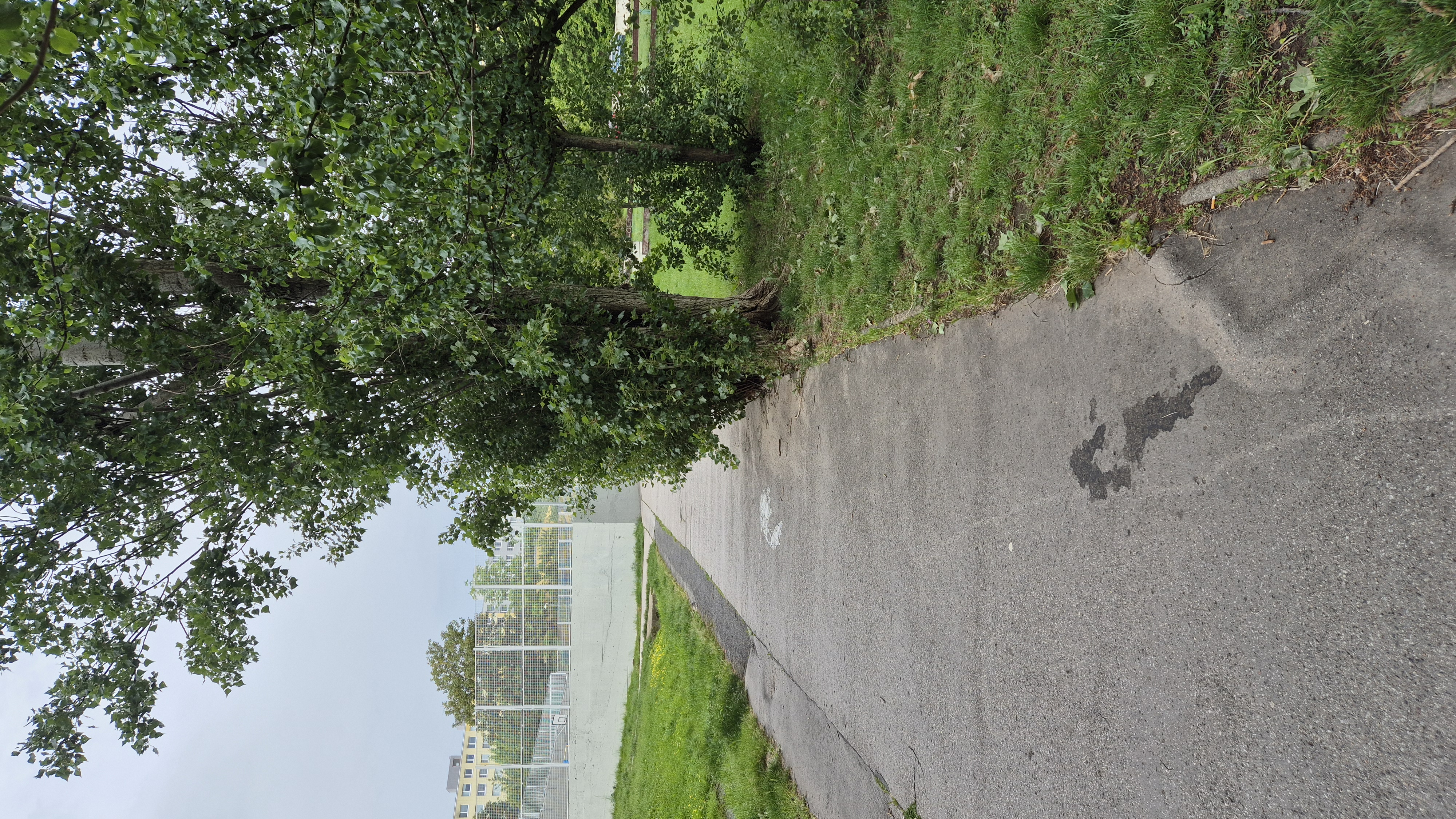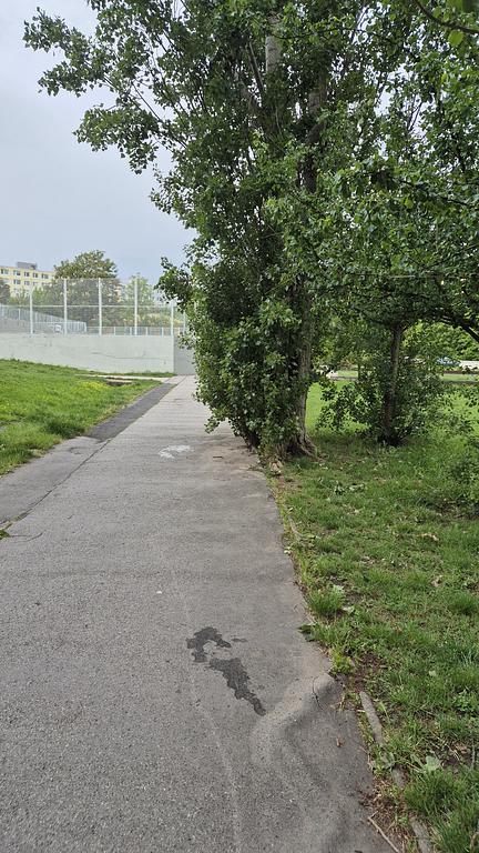 Větve ze spodní části kmene stromu zasahuji až do 1/3 chodníku.