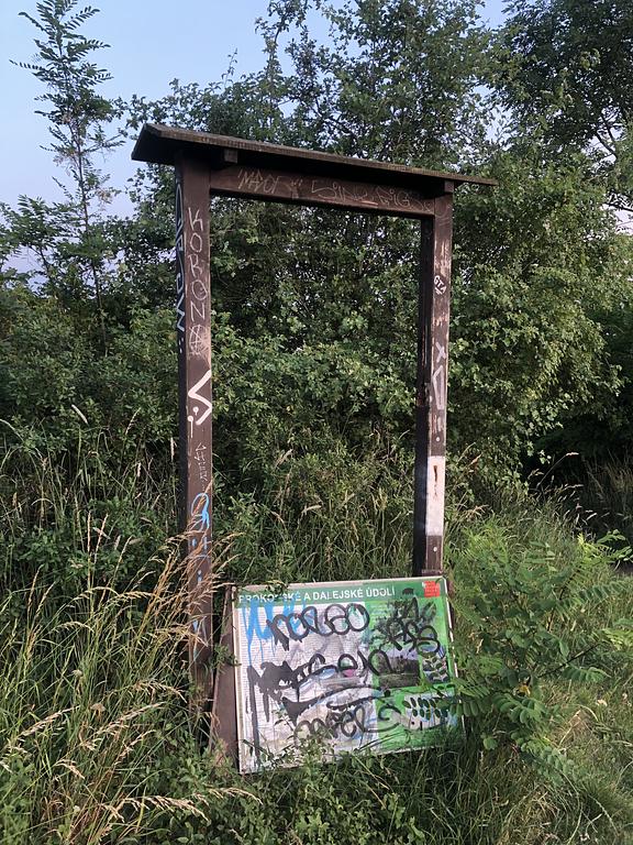 Stojan s popiskem údolí se rozbil a nejde přečíst přes grafiti