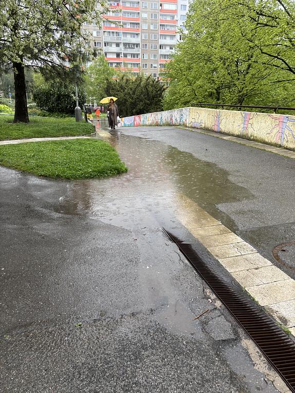 Ucpaný odtokový příkop/kanál u zš Trávníčkova, i při menším dešti voda nestíhá odtékat a valí se po chodníku