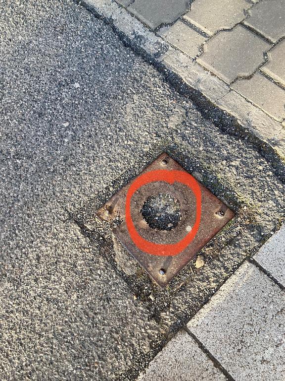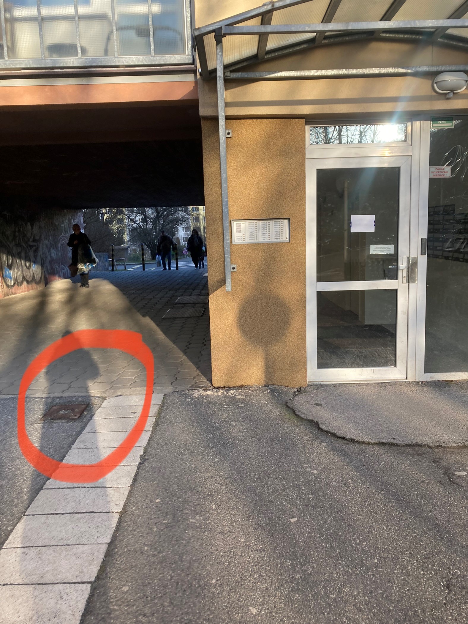 Je zde ostrý, trčící kus železa, pravděpodobně po deinstalaci nějakého železného sloupku. Na tomto místě prochází/projíždí mnoho dětí a mohlo by to způsobit nepříjemný úraz.