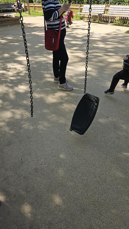 rozbitá houpačka na hřišti, skvělá příležitost tam konečně dát houpačku pro miminka, která je tady jenom jedna