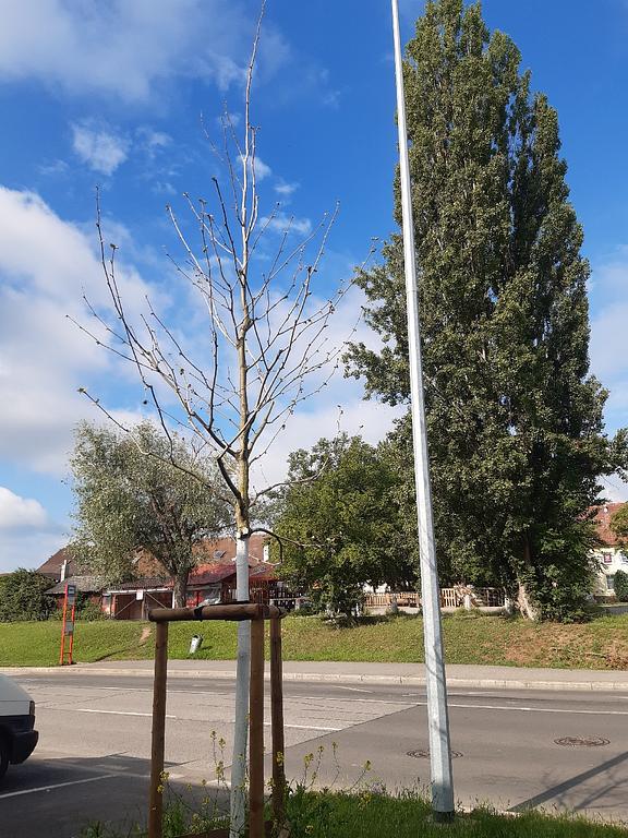 Uschlý mladý topol, který byl před pár lety vysazen jako náhrada za strom, který výsledkem své neodborné práce poškodila firma, která stavěla parkovací záliv v Červeňanského ulici. Uschlý strom je přímo u zastávky Ohradské náměstí.