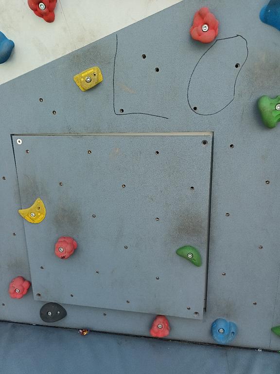 na boulderu chybí 3 šrouby u krycí desky, na které jsou i tři chyty, nebezpečné!