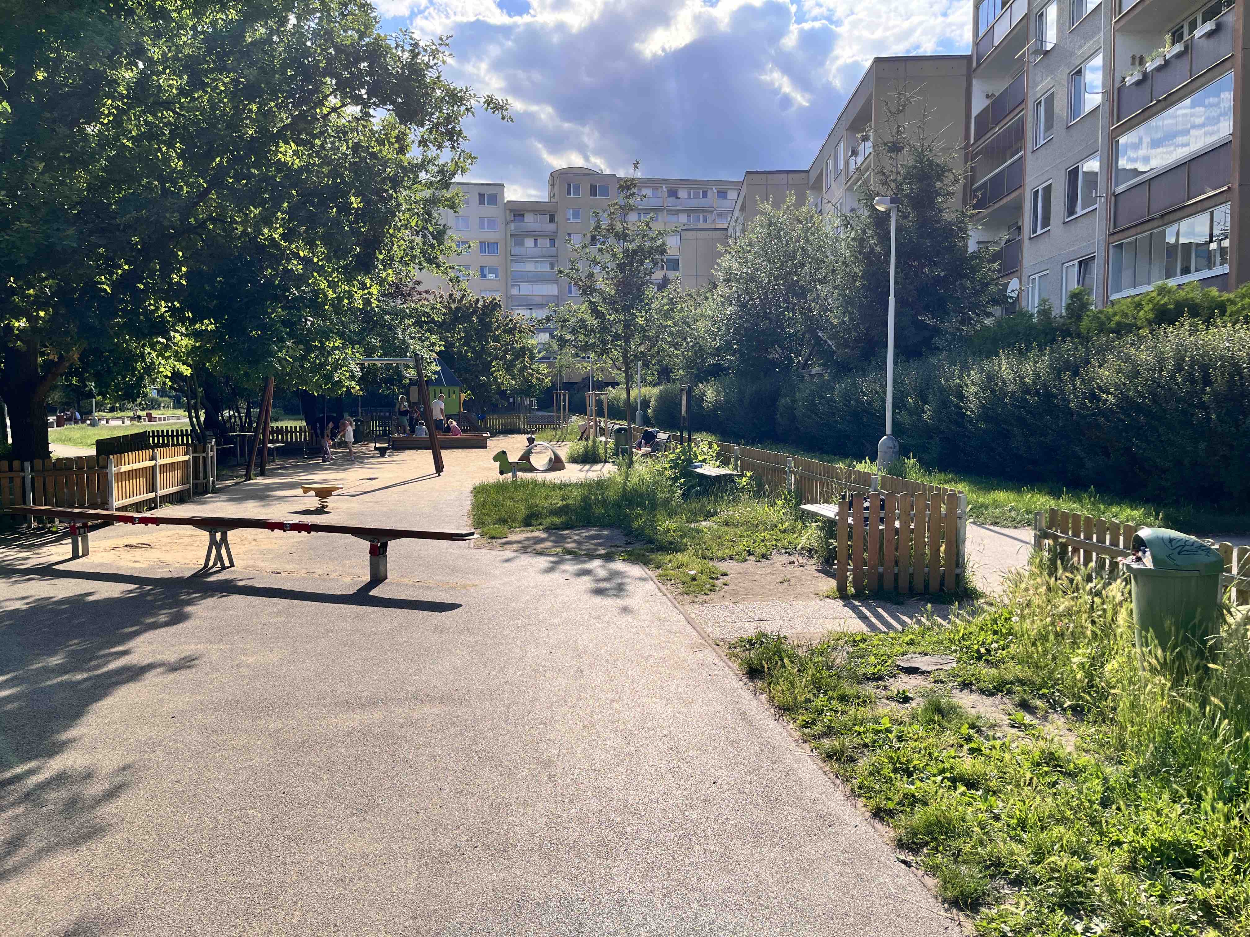 Neposekana trava vysoka 30 cm na velkem hristi prd ZS Otakara Chlupa, idealni aby deti chytli klistata a meli boreliozu