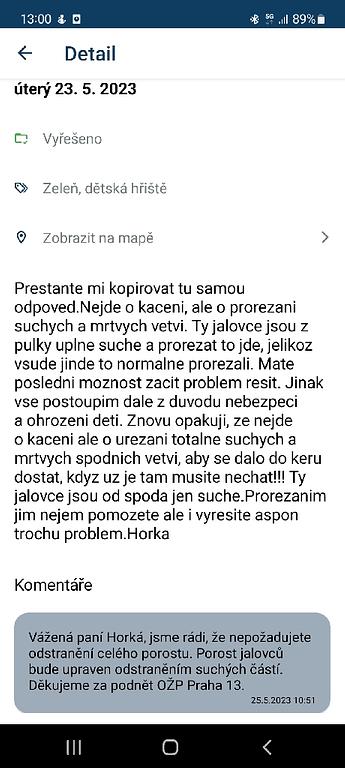 Dobrý den, Vámi nahlášenou závadu jsme postoupili k prošetření Odboru životního prostředí ÚMČ Praha 13.