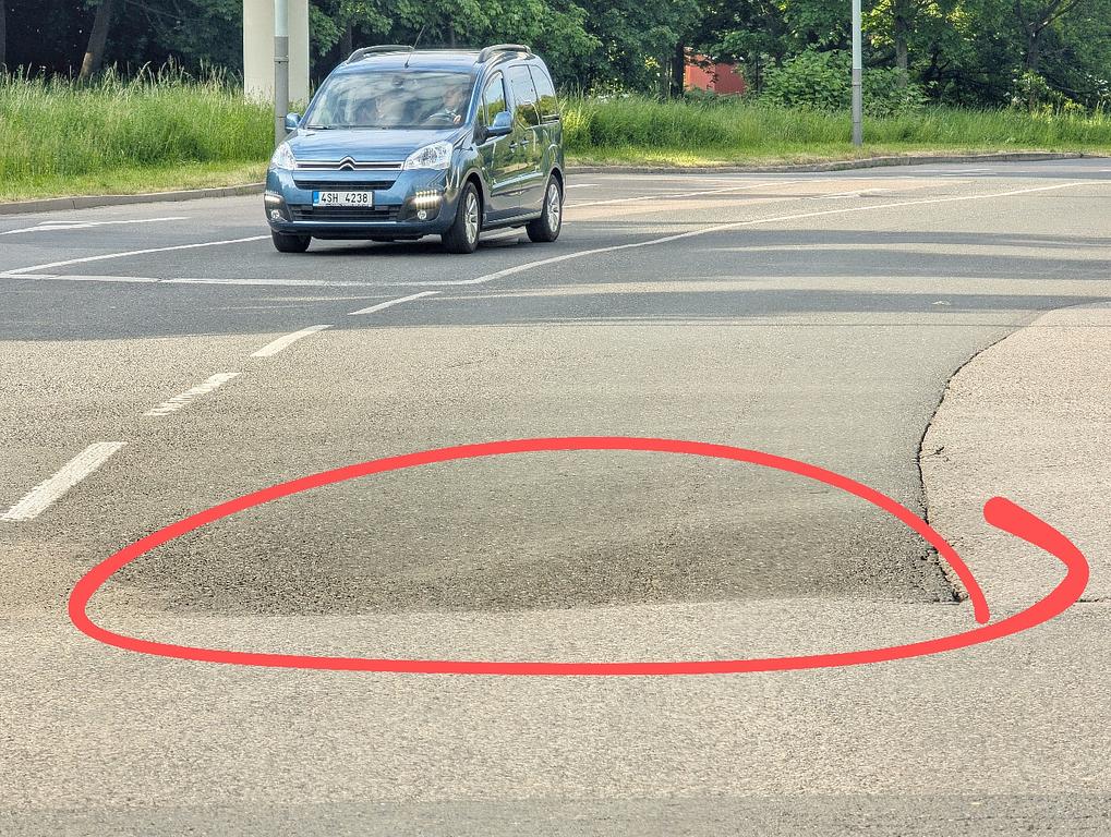 Velmi výrazný hrbol na silnici, je potřeba zarovnat. https://maps.app.goo.gl/BZAQEGbwtkF3dyc89