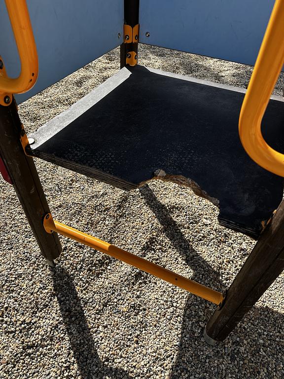Znicena deska na dětském hřišti v ulici Bellušova, hrany díry jsou celkem ostré