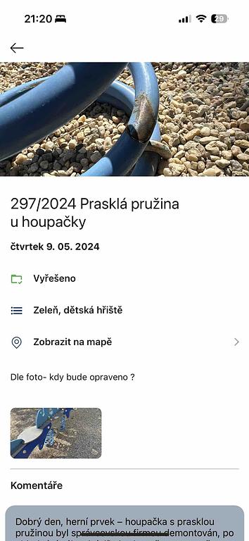 Dobrý den, houpačka byla z bezpečnostních důvodů na čas demontována a nová pružina objednána. Jakmile náhradní díl přijde, bude správcovskou firmou opět herní prvek zprovozněn. Bohužel dodací termíny náhradních dílů od jejich výrobců neovlivníme.