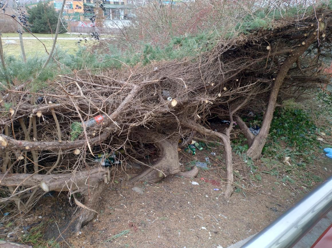 Nedávno zde čistili pracovníci skleněné střechy u metra, prostor byl ohražený, ale nedomnívám se, že to způsobili oni. Teď někdo keře ořezal a nepořádek se objevil.
