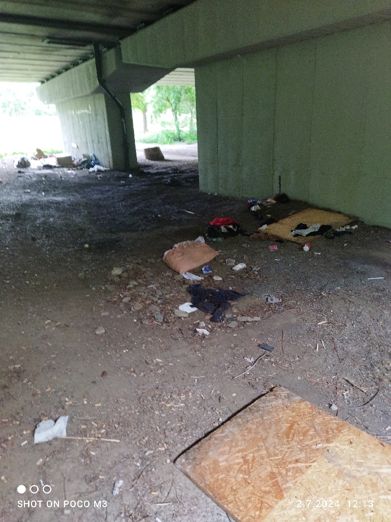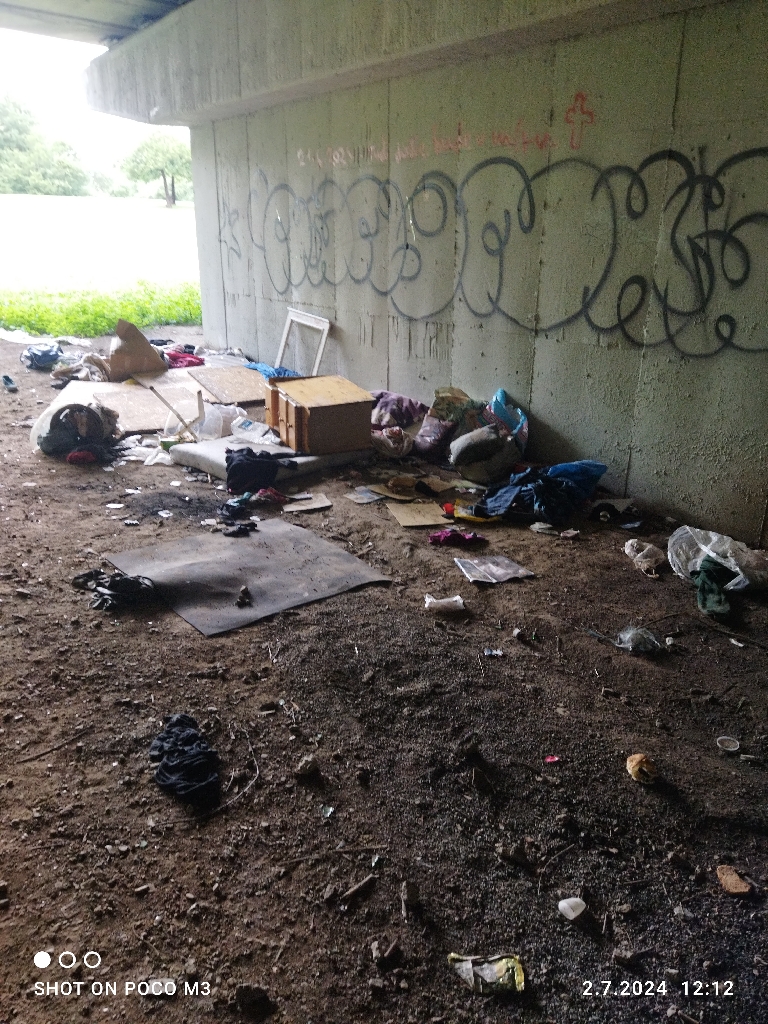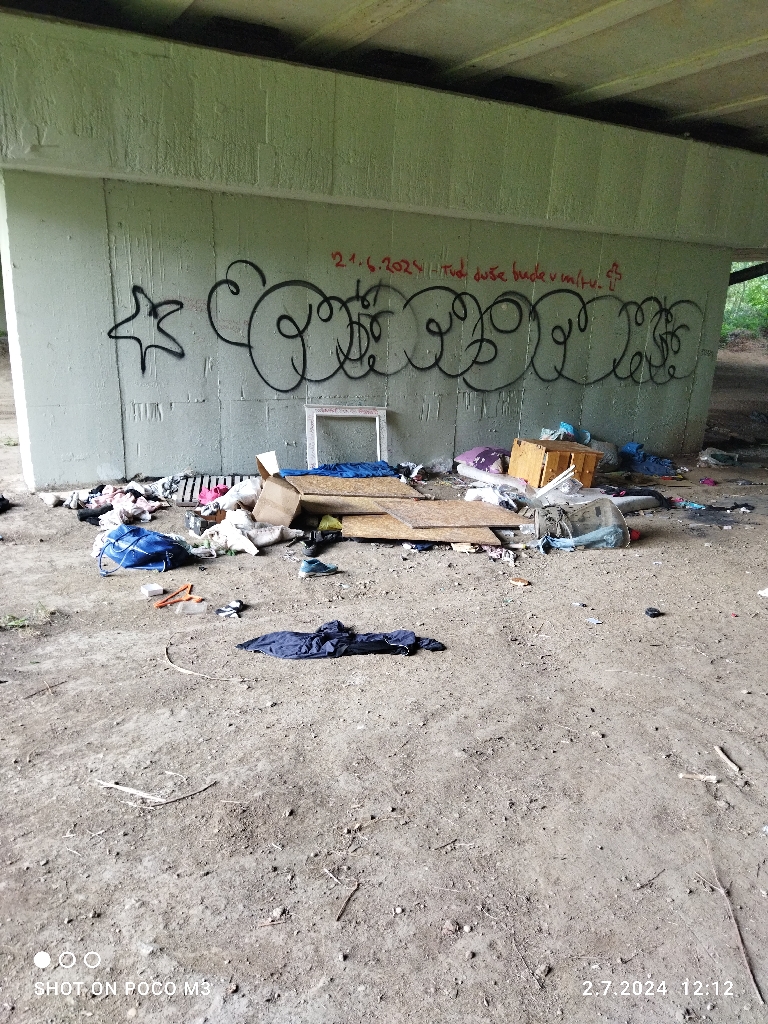 Skládka zahrnuje dřevěné prefabrikáty a další neidentifikovatelný materiál v blízkosti centrálního parku pod přemostěním v ulici Jeremiášova