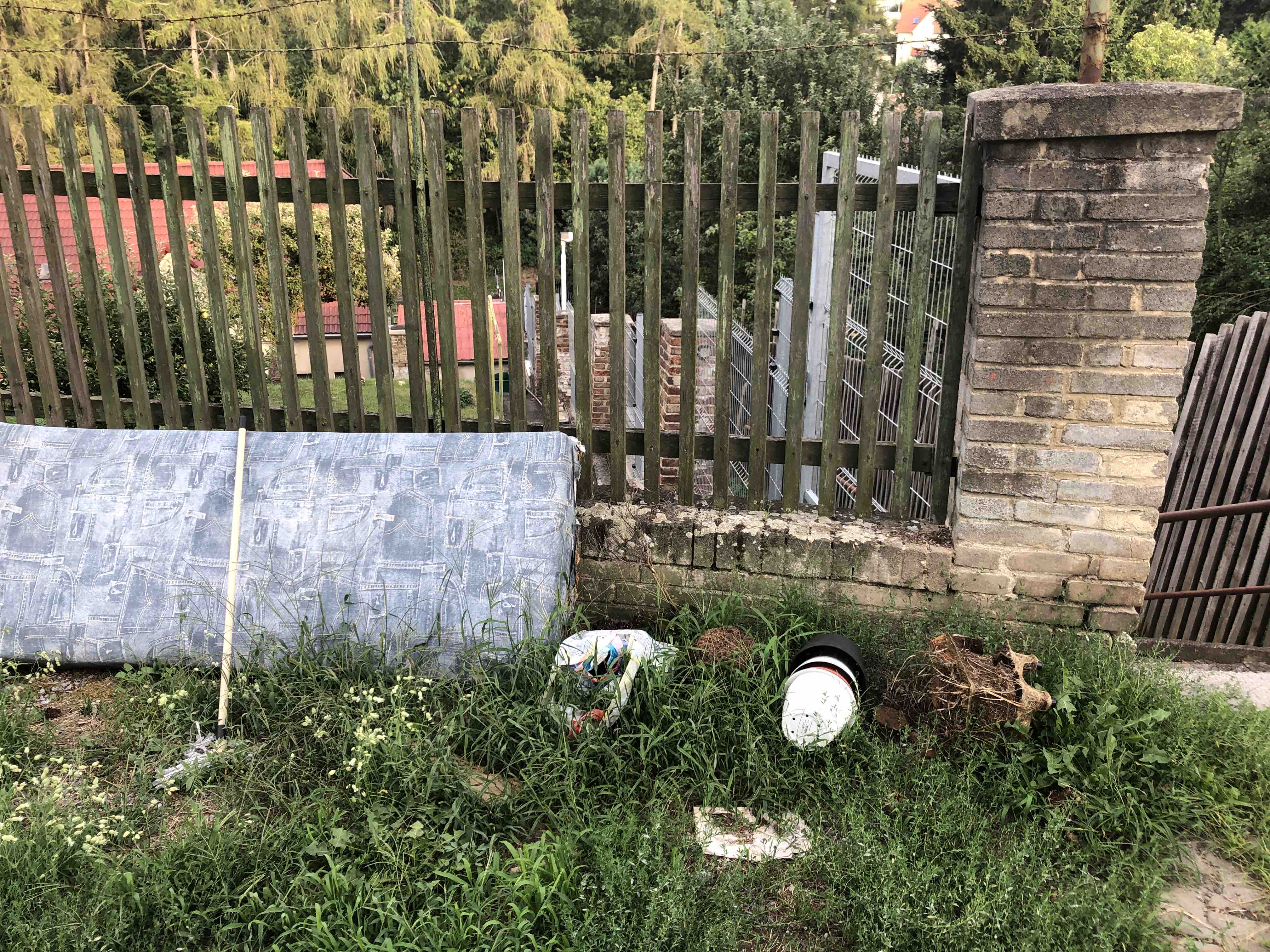 Odložená část postele a zahradní hlína s květináči v ulici 5. máje před domem 580/43.