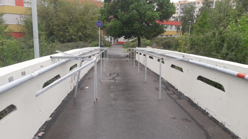 na pěší lávce přes Oistrachovu ulici (N50’02″45, E14’18″56) je poškozené ocelové omezovací zábradlí