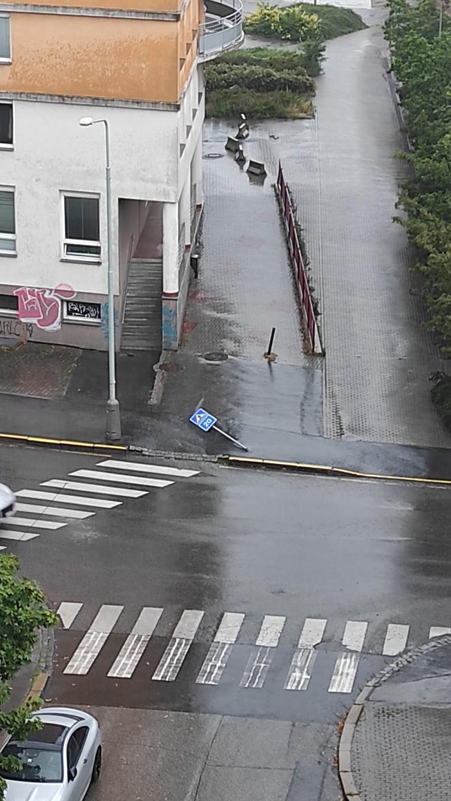 v ulici Petržílkova na přechodu k metru Hůrka je čerstvě poražená značka.