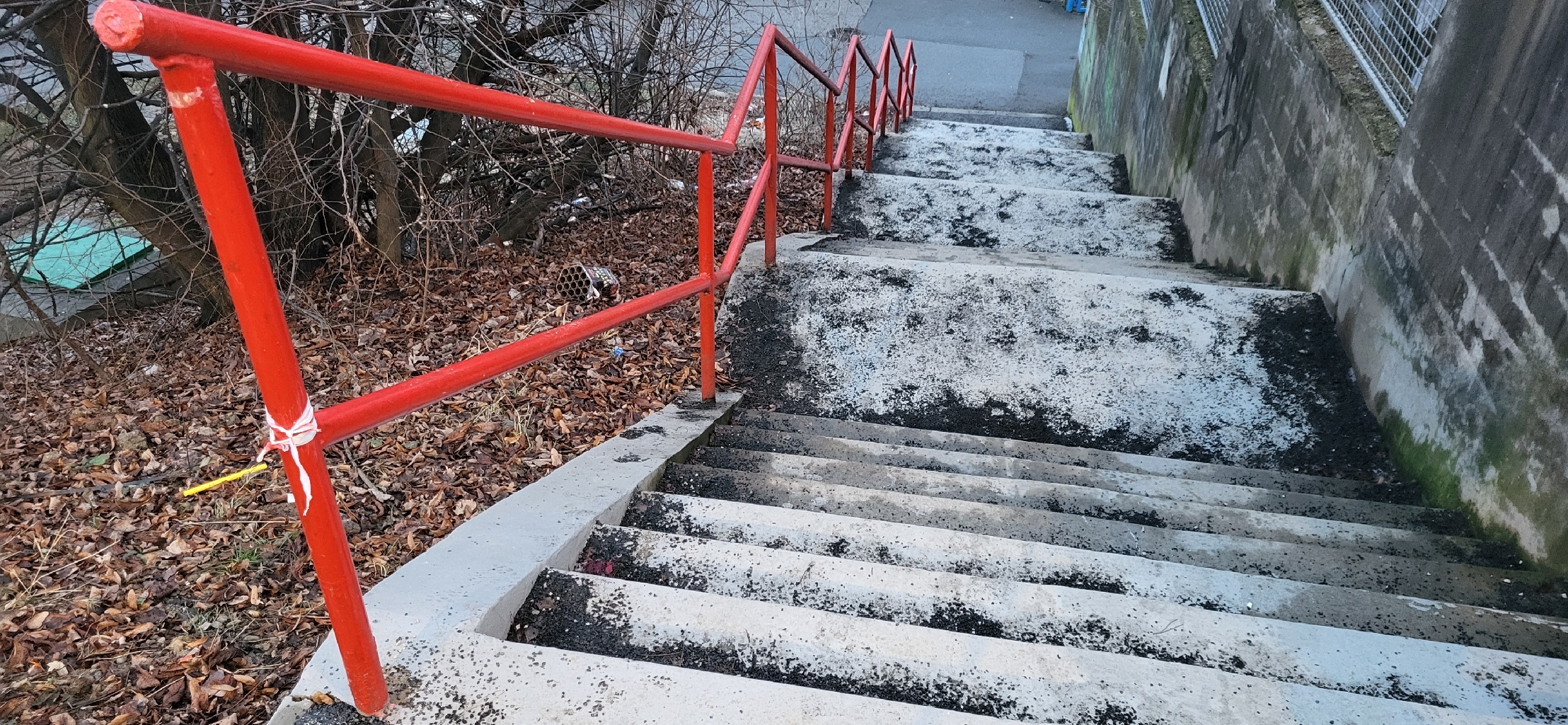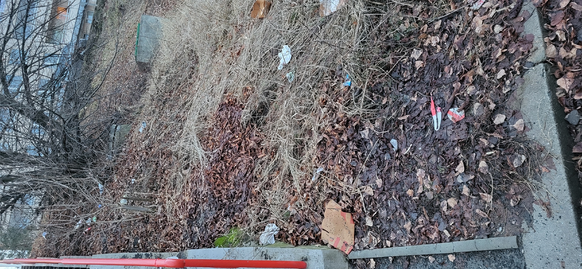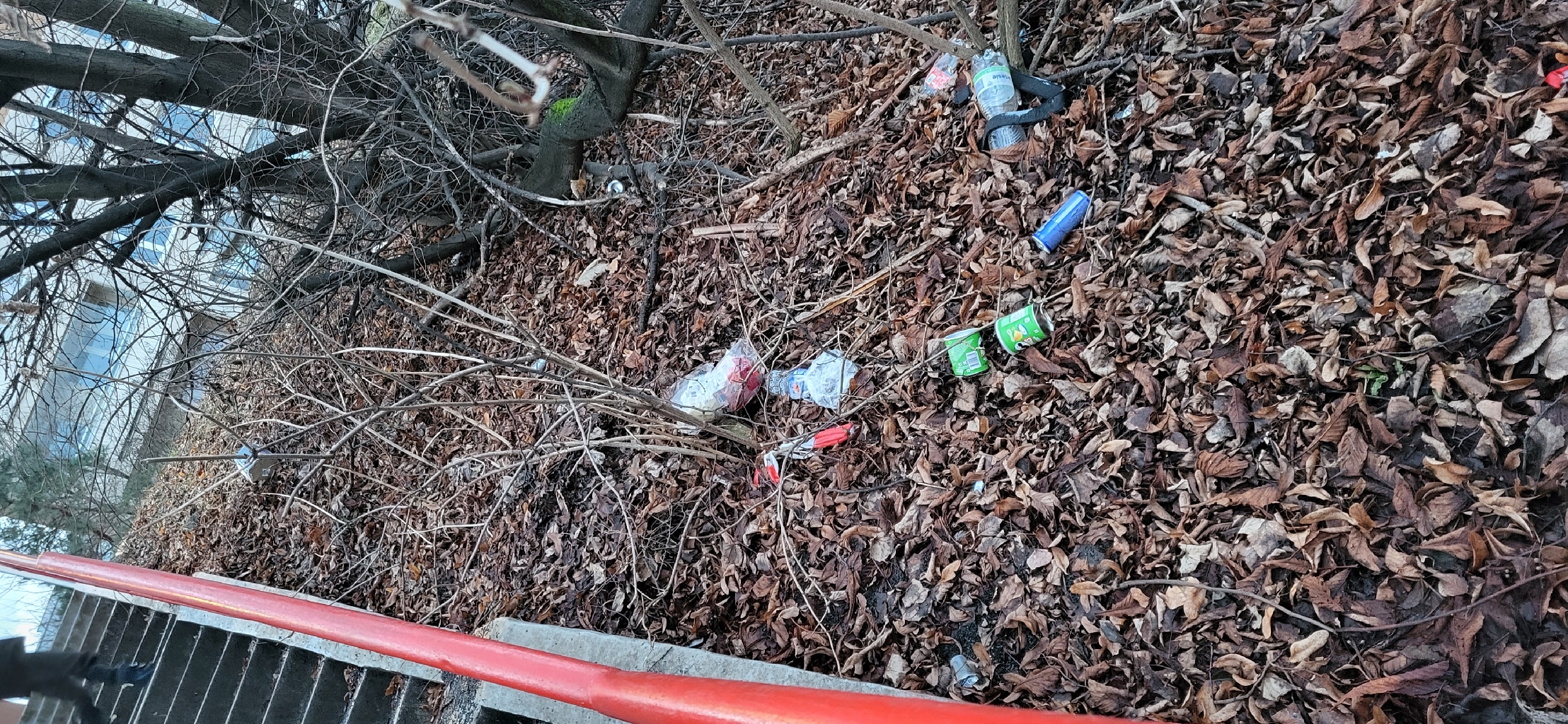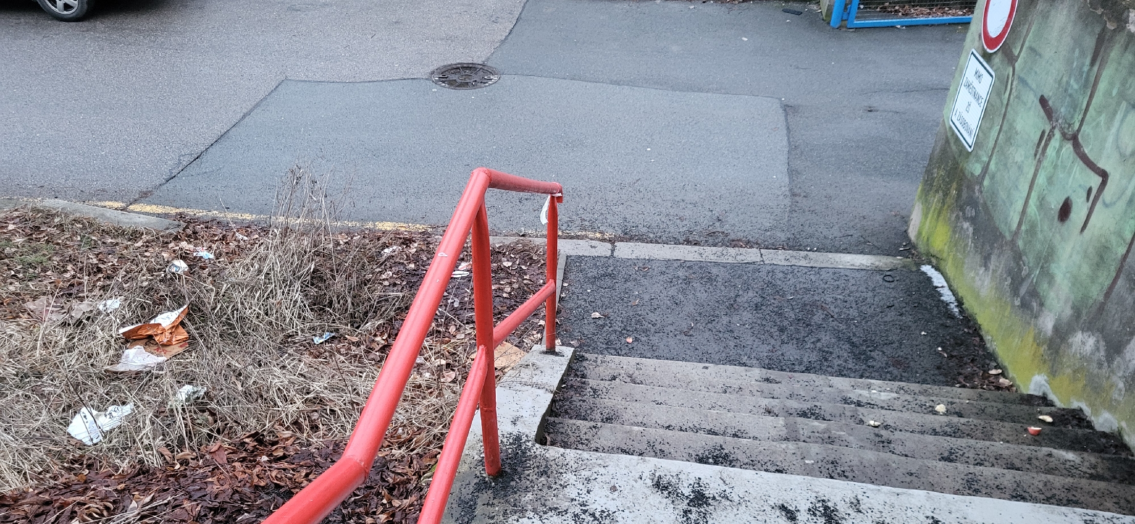 Již několik týdnů se povalujicí odpadky v neposečené trávě, neudržovaná zeleň, neshrabané listí s uschlými větvemi, neudržovaný strom, který by potřeboval oříznout, poněvadž v době vegetace zasahuje do prostoru schodů, nezametené schody.