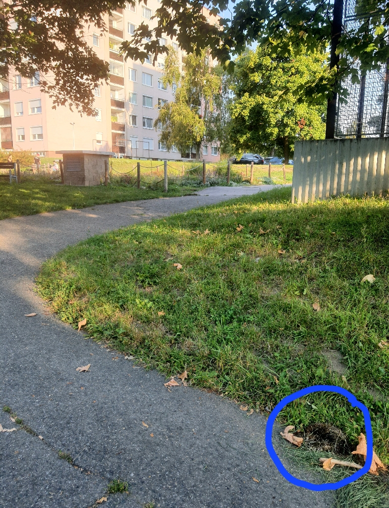 Tlející, mrtvý ježek, pod basketbalovým hřištěm nad školkou Šikulka, v ulici Hostinského.
